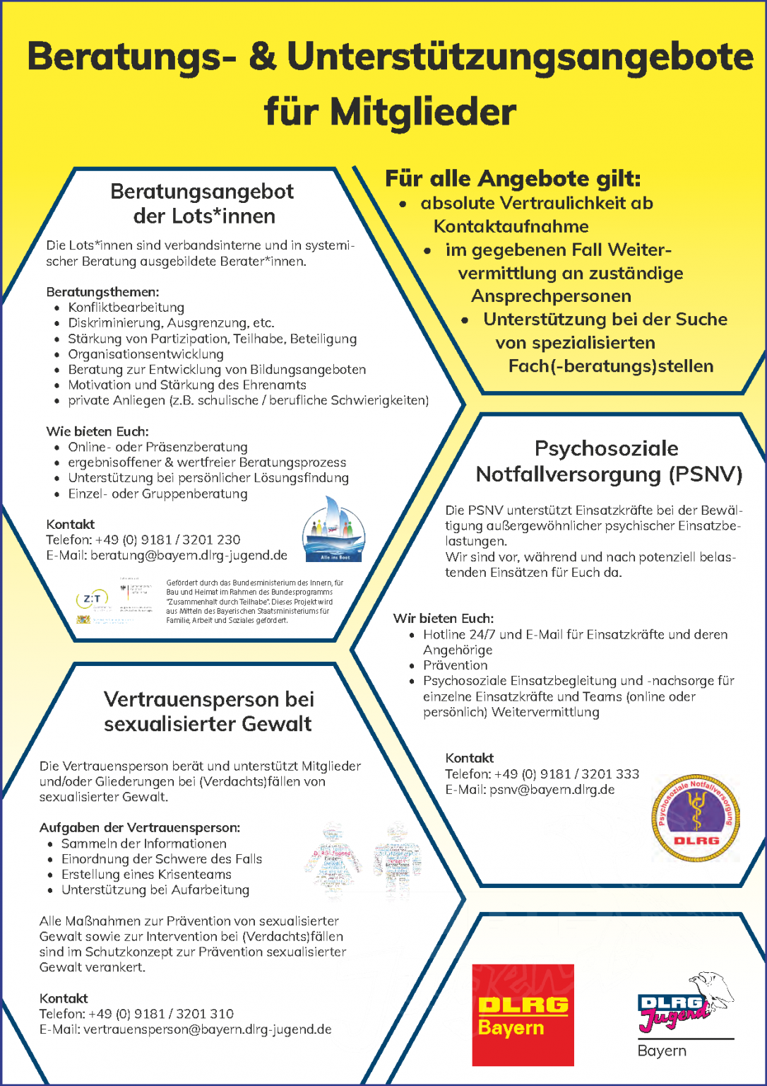 Die Beratungs- und Unterstützungsangebote der DLRG Bayern zur Prävention sexualisierter Gewalt, zur Psychosozialen Notfallversorgung und das Beratungsangebots der Lots*innen sind auch auf einem Plakat übersichtlich zusammengefasst. Es steht als Download zu Verfügung.