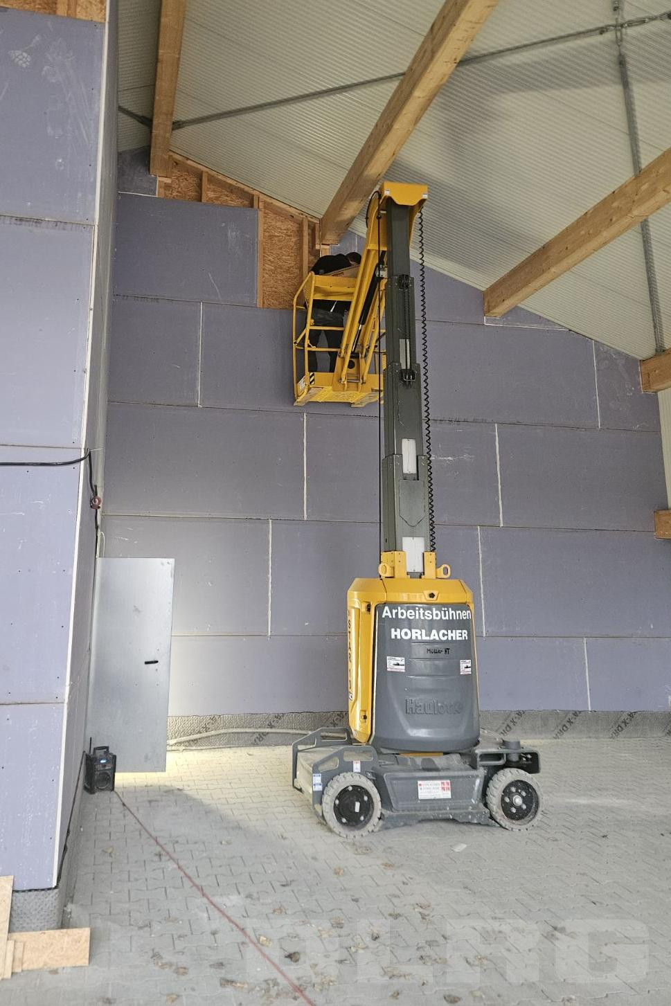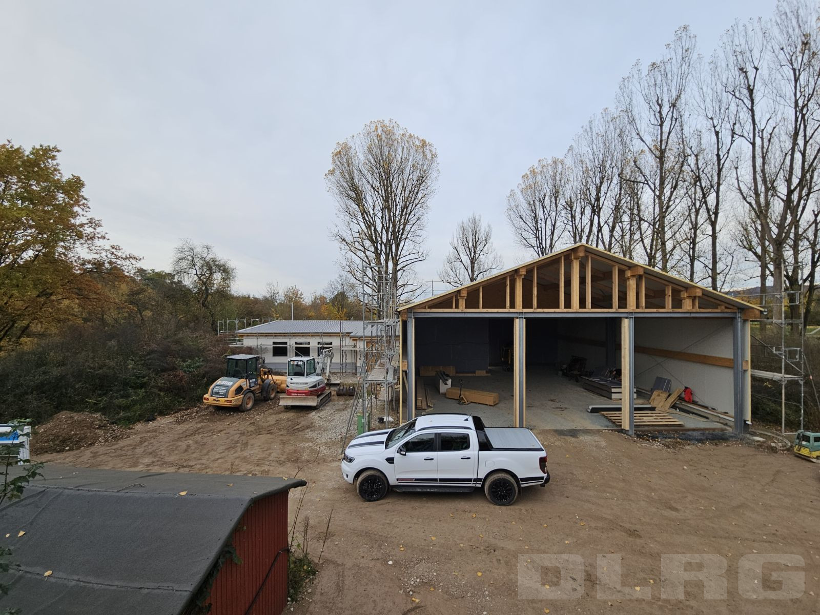 Trägerelemente der Fahrzeughalle und Kran stehen