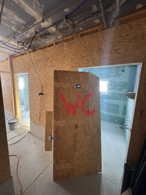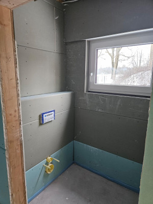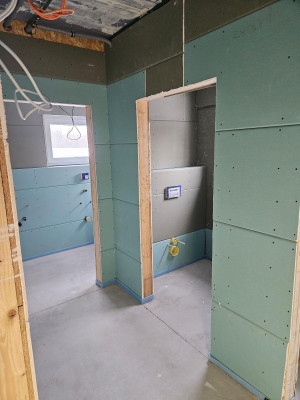 Am Wochenende mussten wir unsere provisorische Toilettentüre ausbauen, um die letzten Vorbereitungen, insbesondere die Montag der Rigipsplattten, treffen zu können. Der Fliesenleger kann nun in unseren Sanitärbereichen starten.