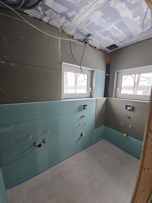 Sobald der Fliesenleger durch die Sanitäranlagen durch ist, folgen hier neue Bilder.